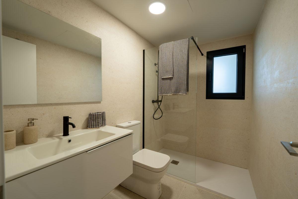 Las cocinas se entregan totalmente equipadas con mobiliario moderno y electrodomésticos integrados: horno, microondas, campana oculta y vitrocerámica. Los baños, también de PORCELANOSA, incluyen lavabos suspendidos con muebles de diseño, platos de ducha extrafinos, grifería negra mate y mamparas instaladas.