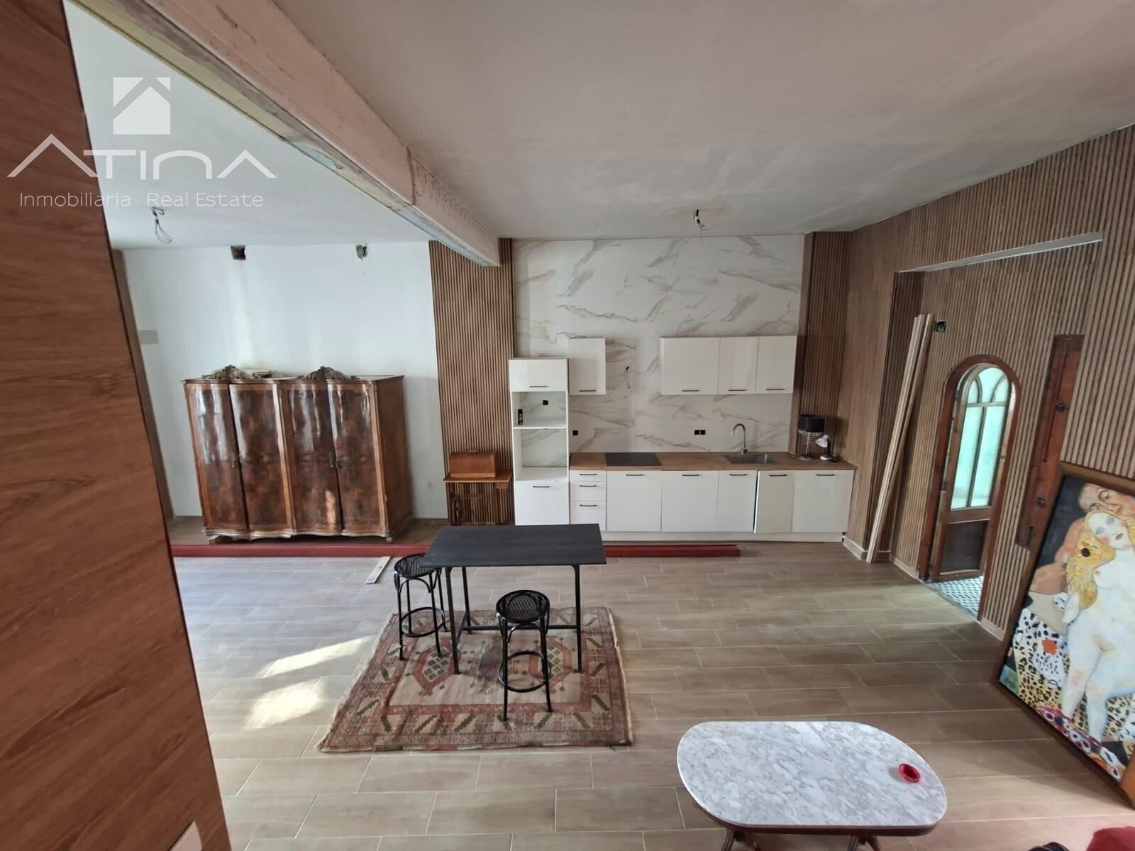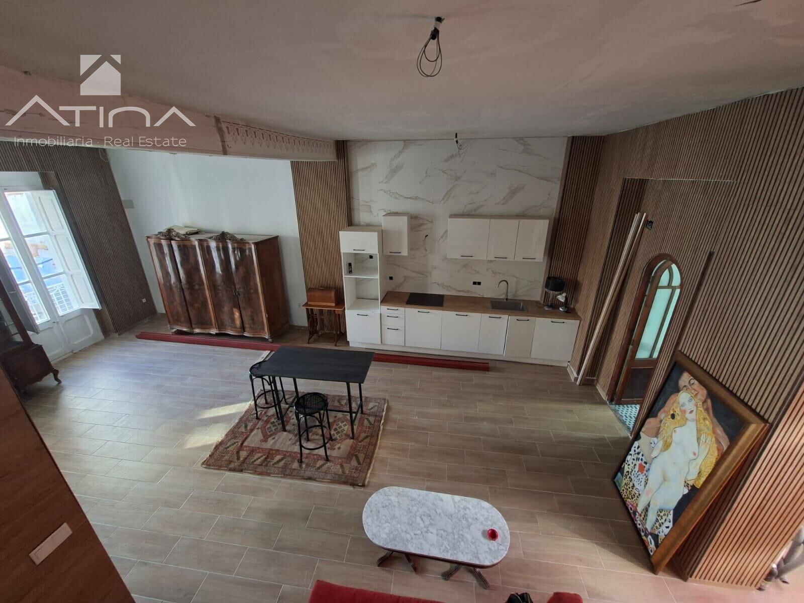 Con aproximadamente 130 m² distribuidos en dos plantas, la propiedad ha sido completamente renovada manteniendo elementos arquitectónicos originales que ponen en valor su historia. La primera planta alberga un amplio salón-comedor con cocina abierta, diseñada con estilo moderno que dialoga elegantemente con los detalles tradicionales. Los grandes ventanales inundan el espacio de luz natural y conectan con una terraza exterior, ideal para disfrutar de momentos de tranquilidad en pleno centro urbano. Un baño completamente reformado completa esta planta, con materiales y acabados actuales que respetan el carácter histórico de la vivienda.